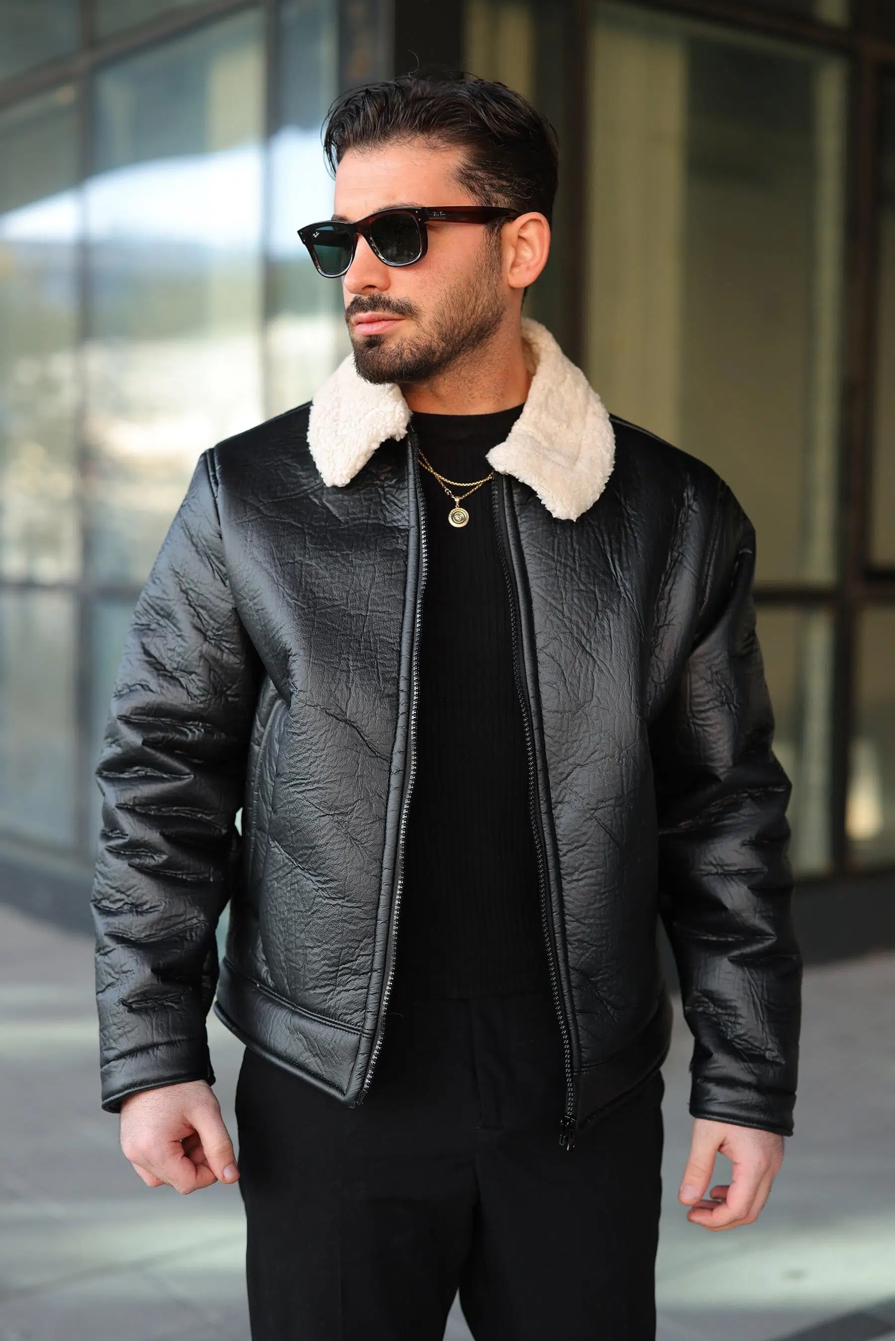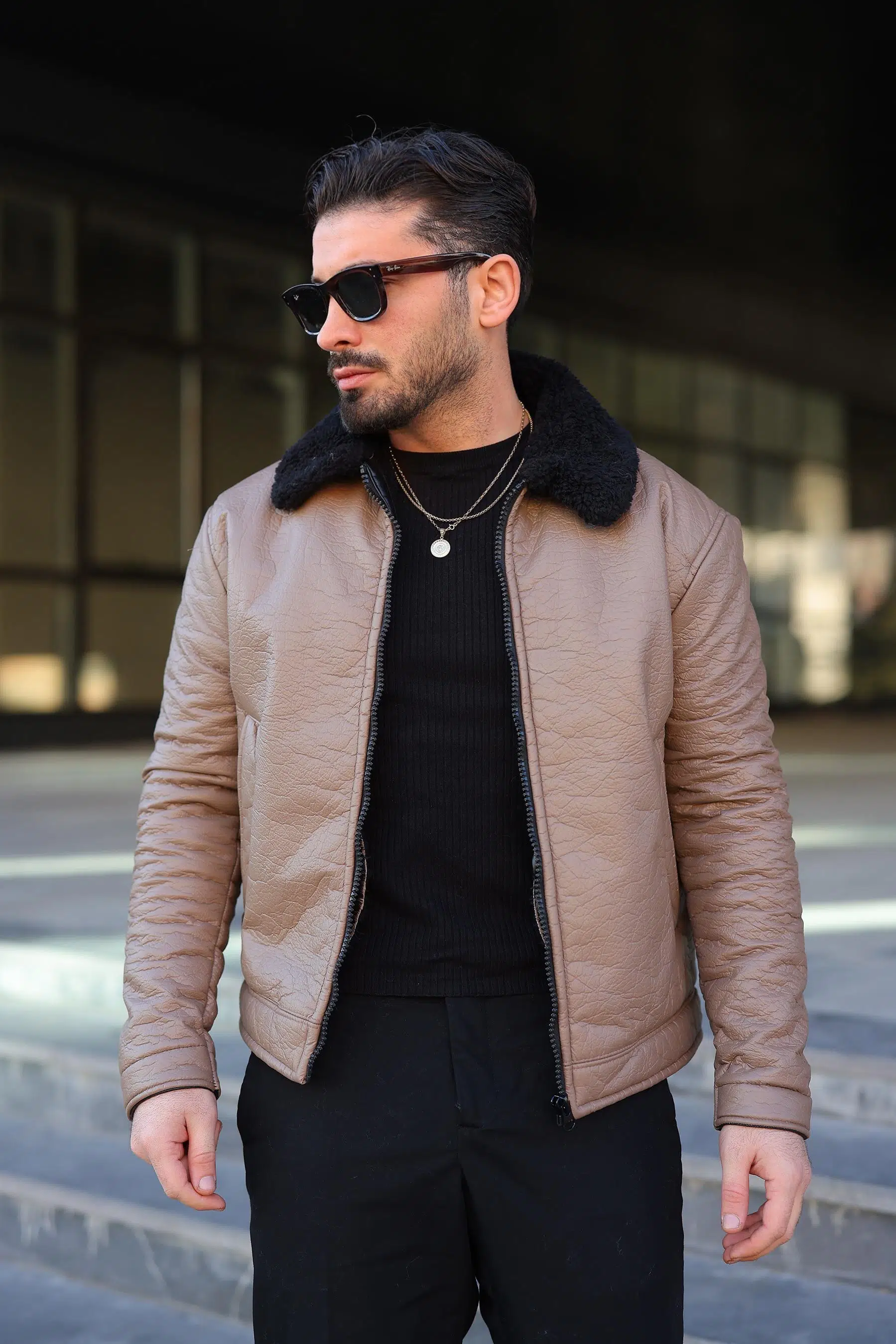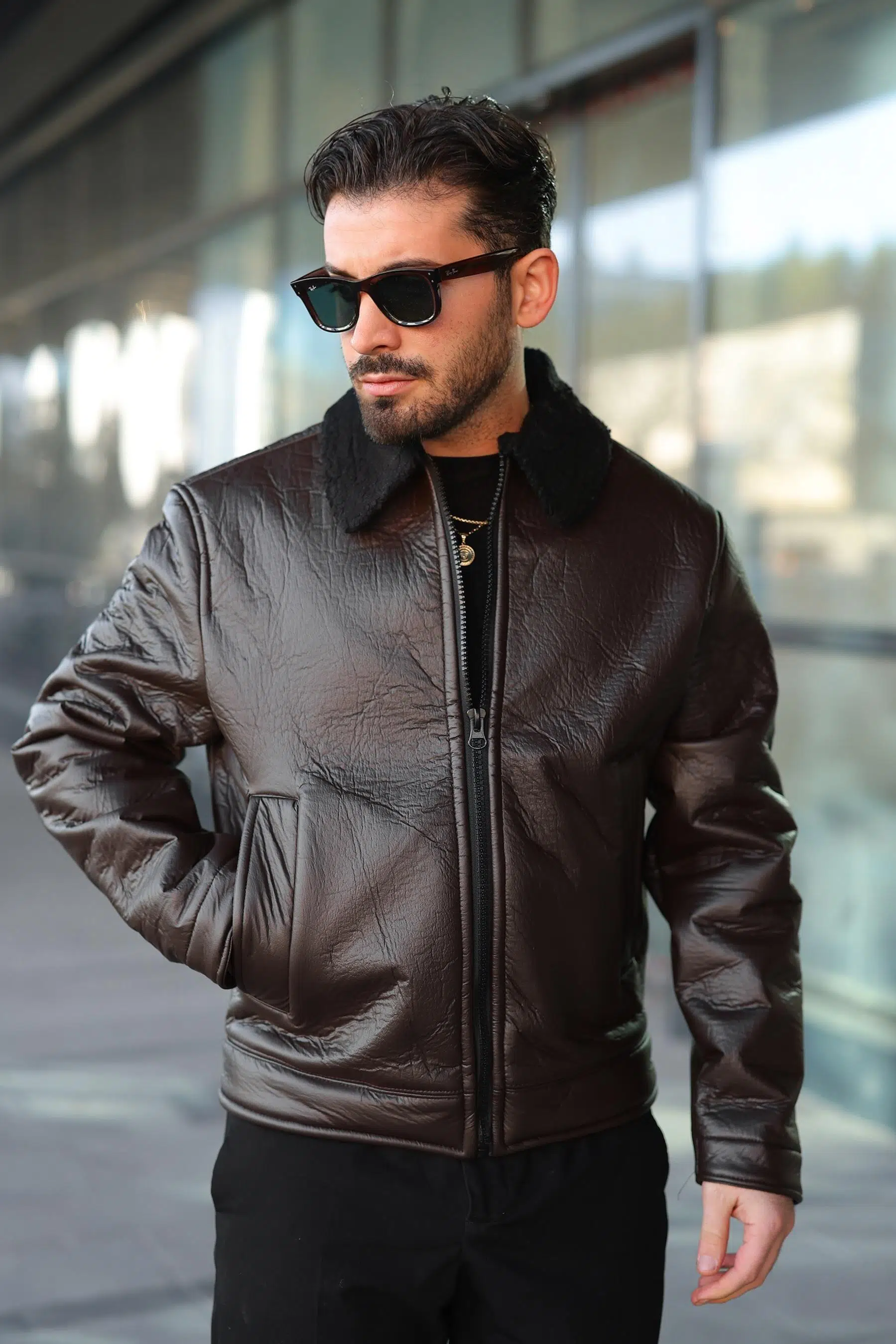 YAKASI KÜRKLÜ DERİ ERKEK MONT