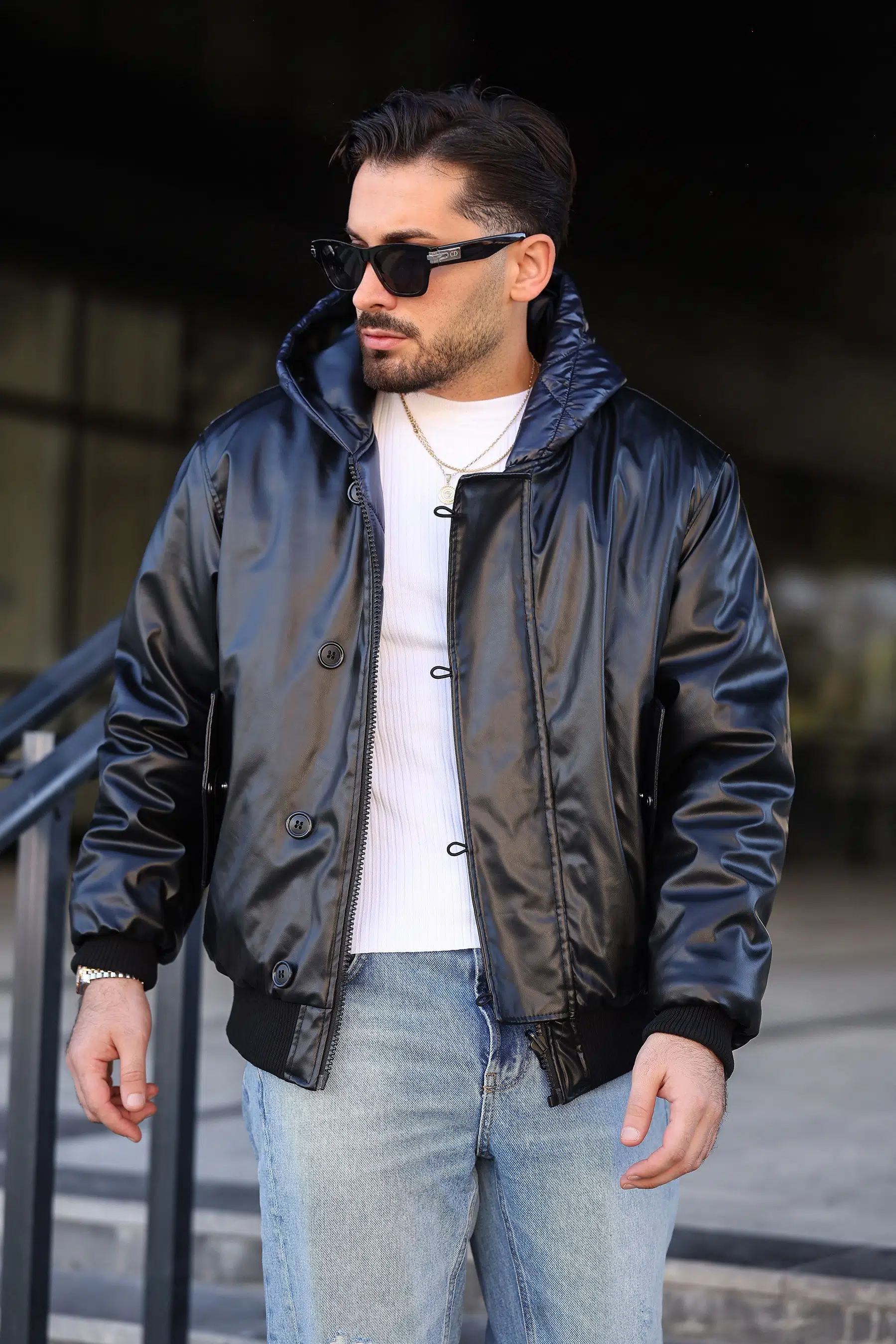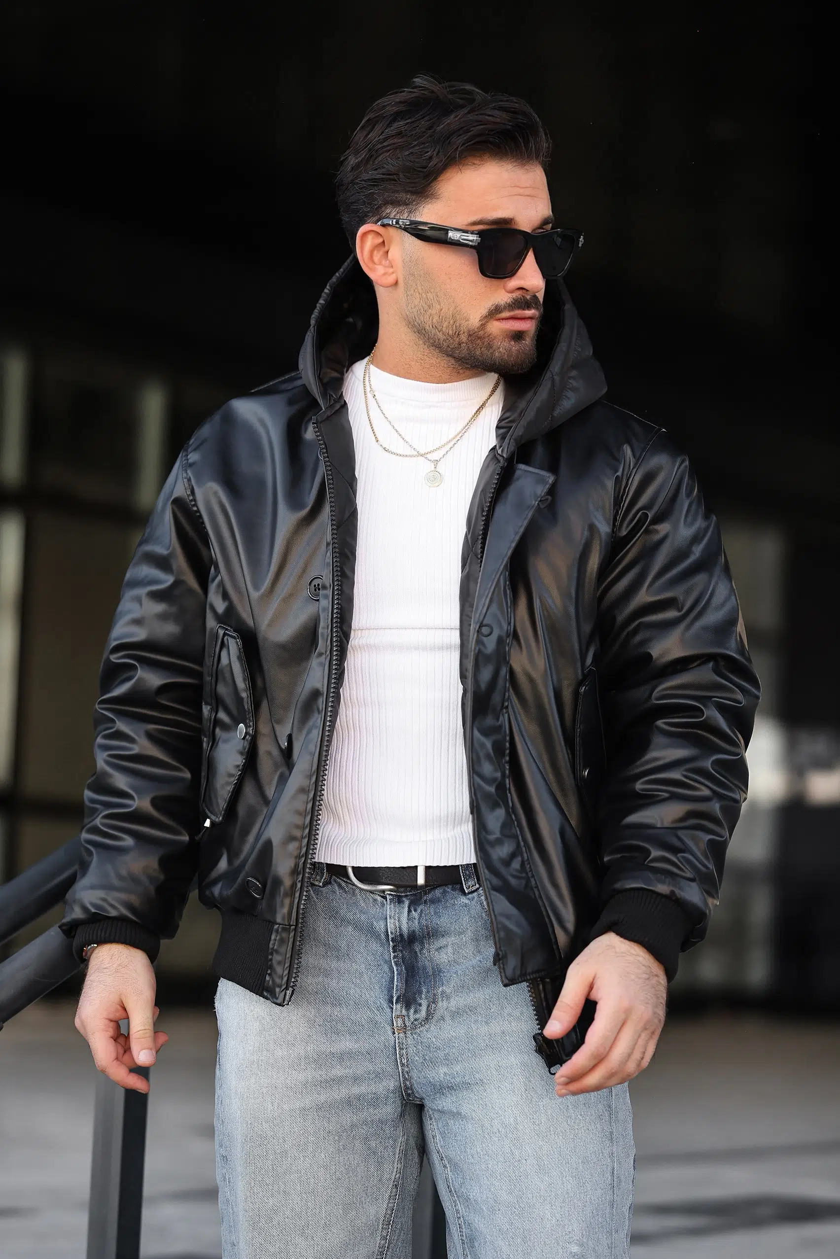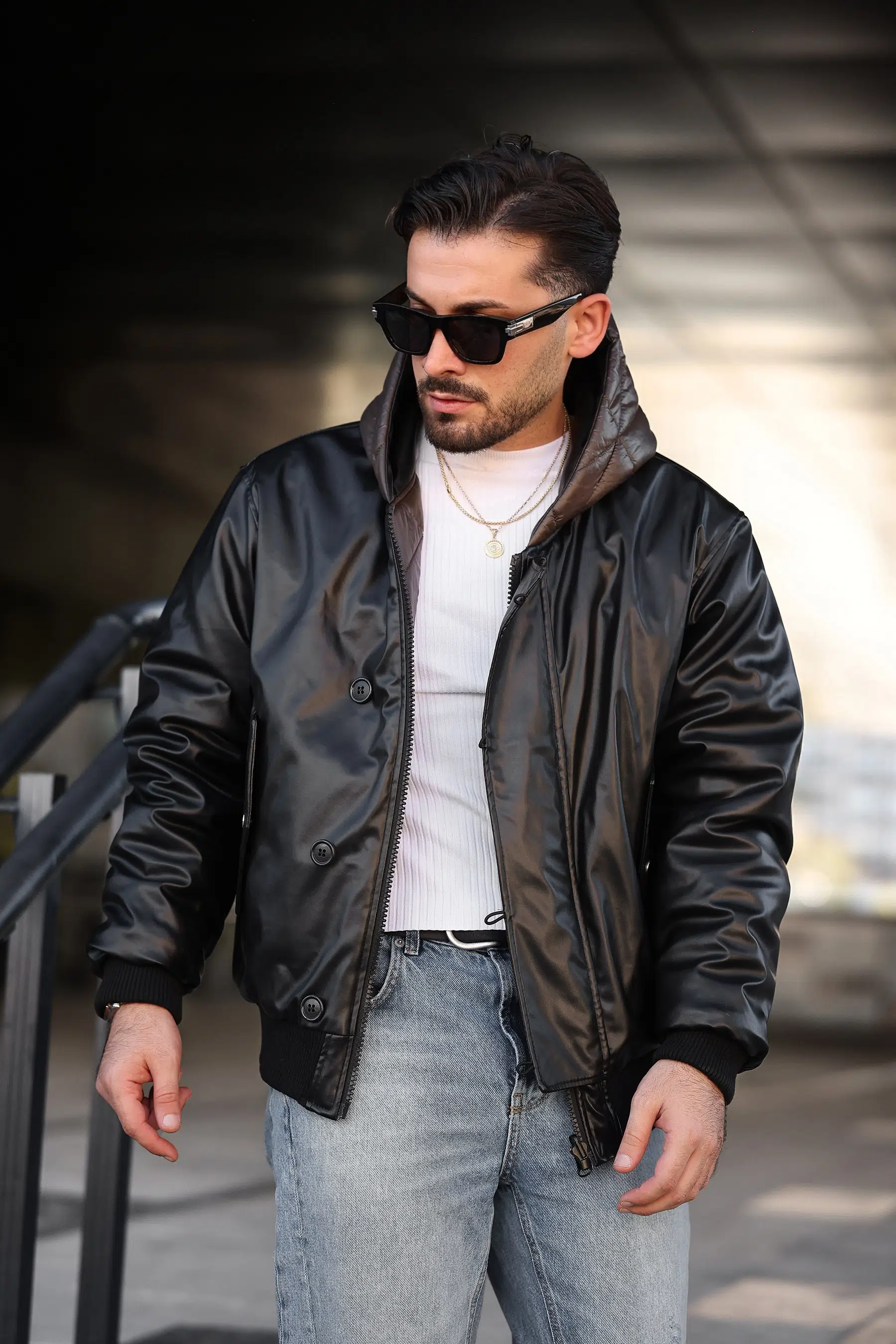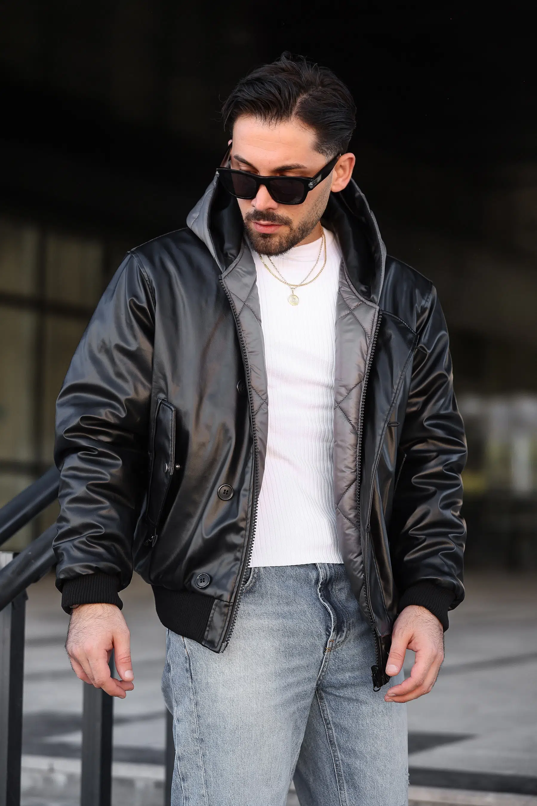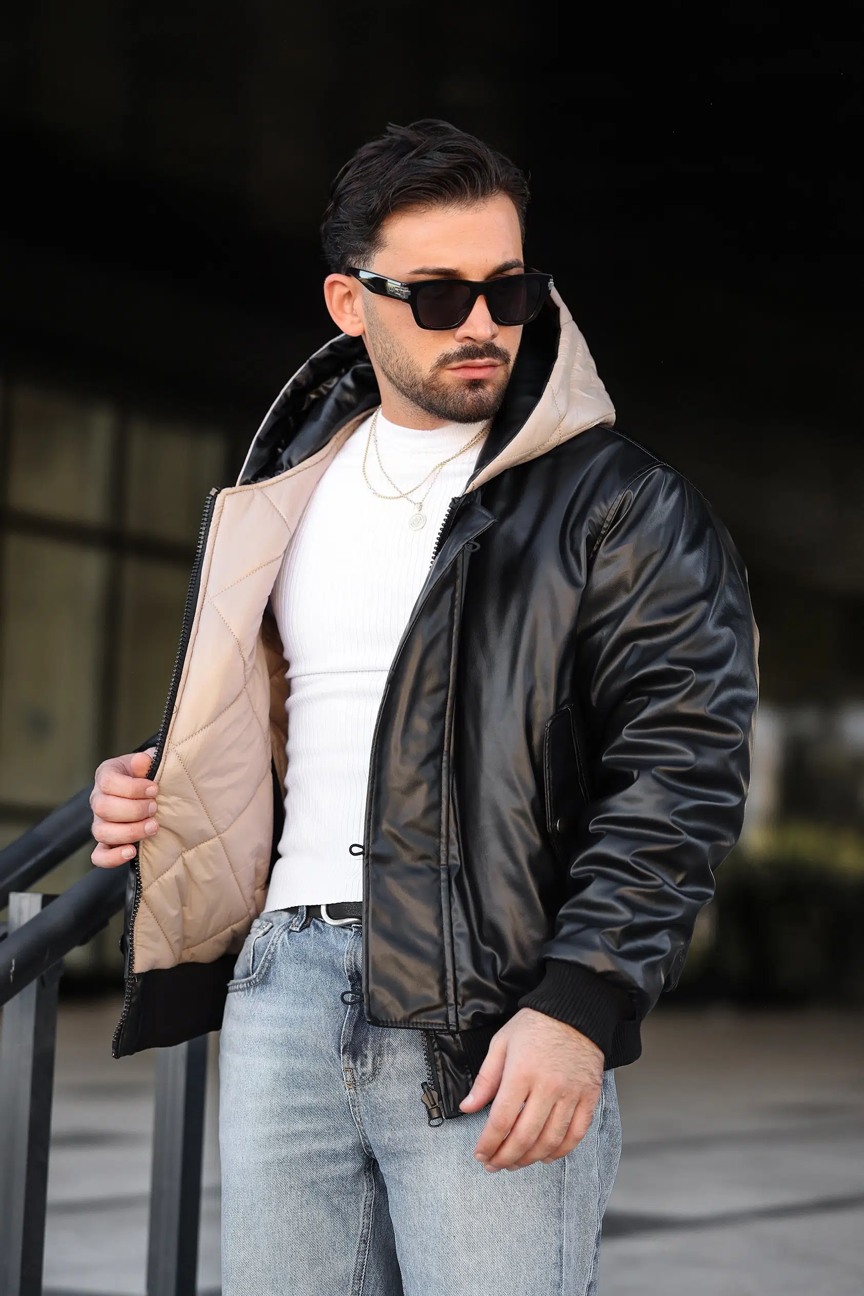 ÇİFT TARAFLI SUNİ DERİ KAPİTONE KAPÜŞONLU MONT
