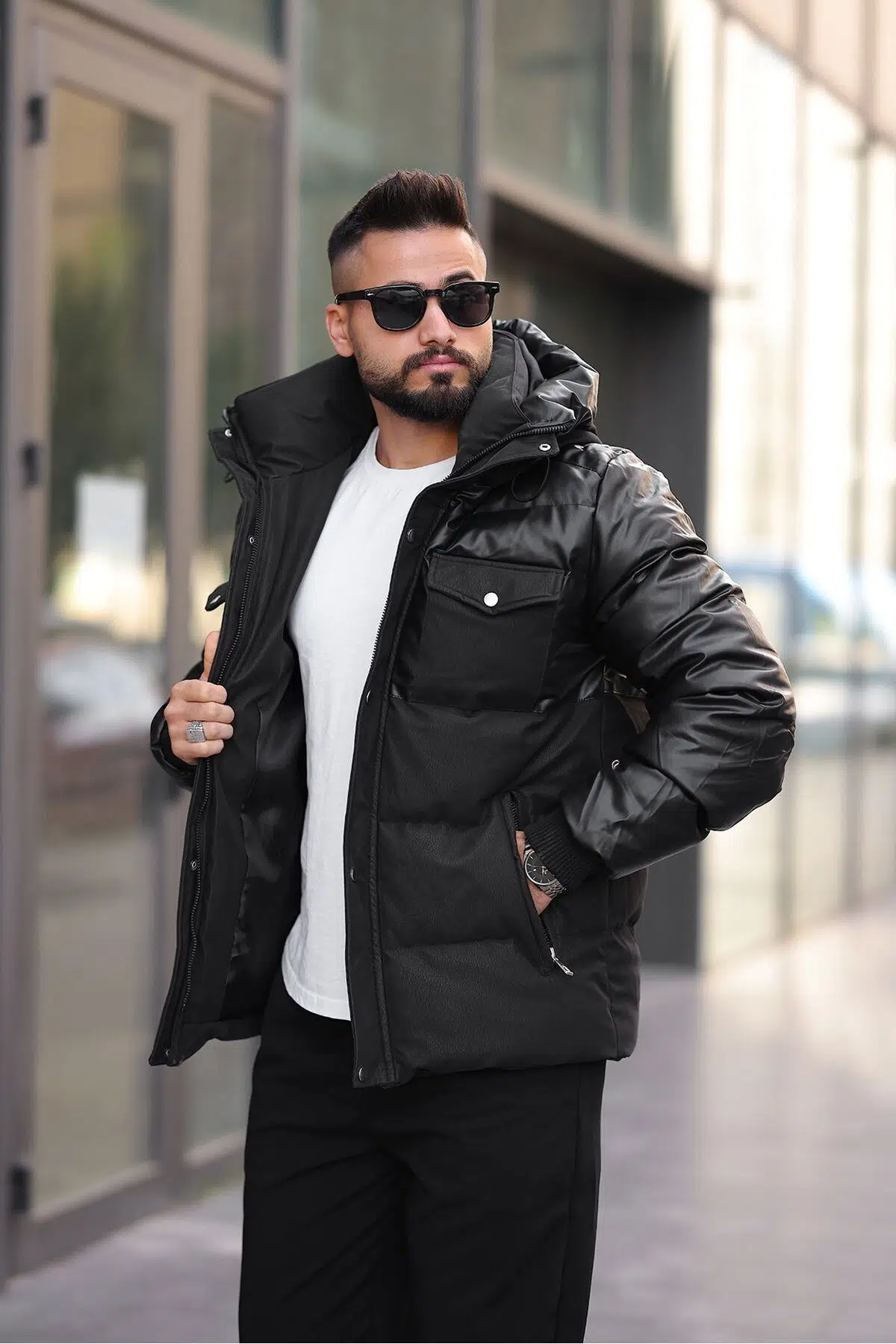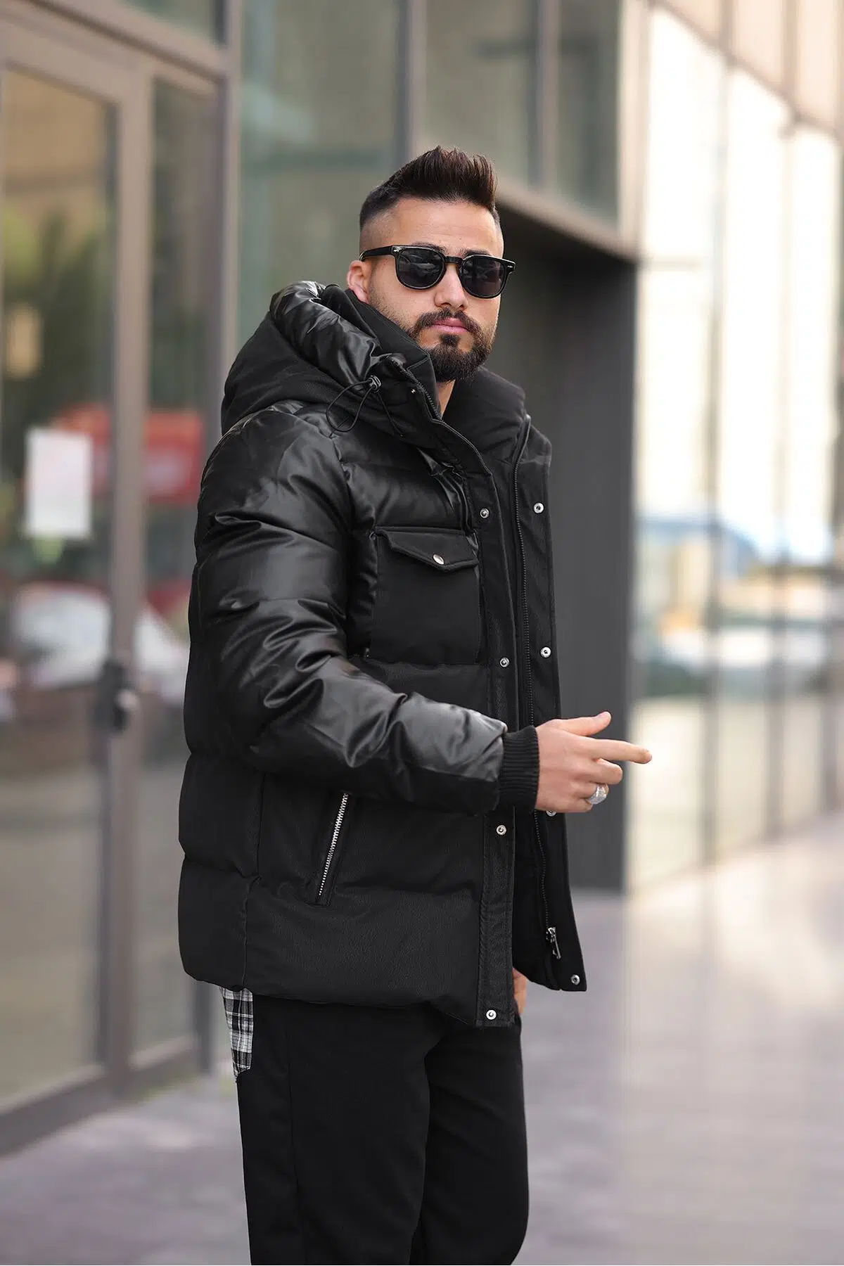 Kapüşonlu Parlak Kumaş Garnili Erkek Şişme Deri Mont